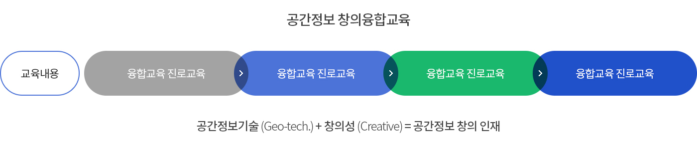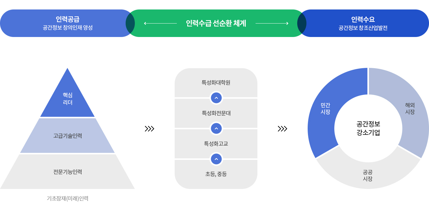 - 공간정보산업의 성장을 촉진하기 위해 잠재 인력을 키우고 현장 중심의 인력을 배출함과 동시에 지속적인 교육을 통한 핵심인재 양성이 될 수 있는 공간정보 인재양성 체계 마련
