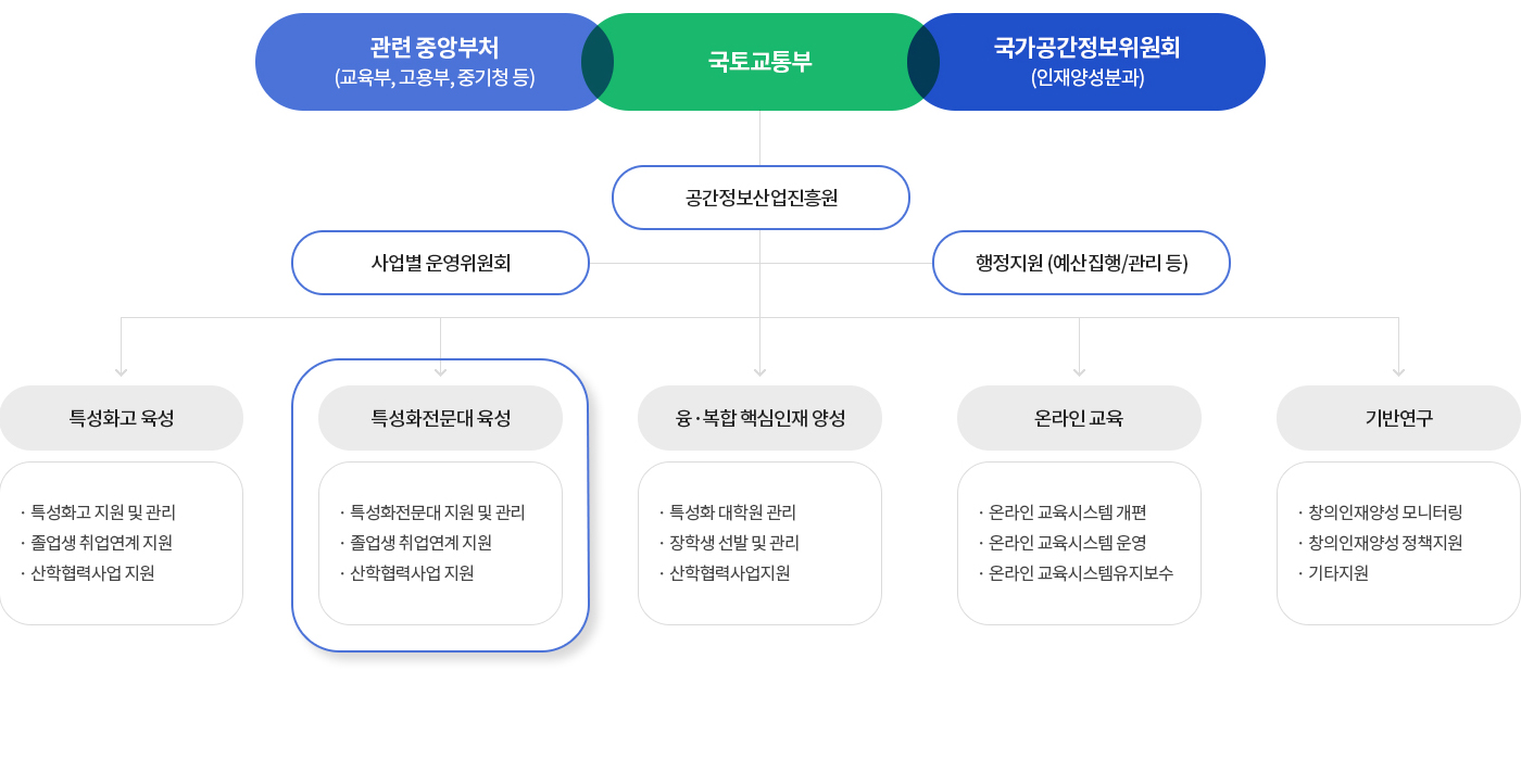 공간정보산업 진흥법 제15조(전문인력의 양성), 국가공간정보에 관한 법률 제6조․제10조(정부의 지원),제5차 국가공간정보정책 기본계획 및 국가 공간정보 창의인재 양성계획에 근거하여 국토교통부 (공간정보산업진흥원 위탁)에서 주관하여 특성화 전문대학 육성을 위한 사업 수행을 지원 하고 있음